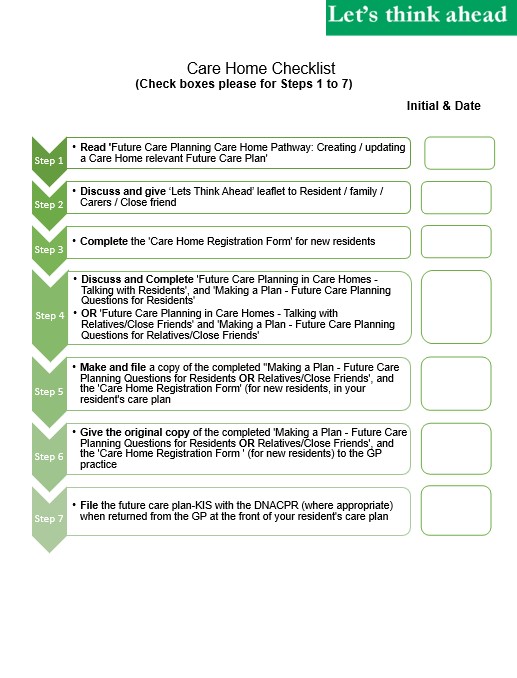 This checklist will help you to keep a record of each step in the future care planning process. Use it to help implement the 7 steps to future care planning in care homes for each resident.