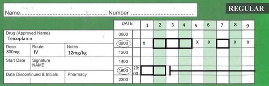 NOTE: There are other Teicoplanin regimens in use in NHS Borders. This guidance does NOT apply to the use of teicoplanin as a three times a week regimen2 or for Hospital at Home patients. Contact Consultant Microbiologist or Antimicrobial Pharmacist for advice on other regimens.
