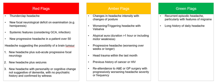 Most patients do not have serious secondary headache. Red flags indicate the need for urgent assessment to exclude a secondary cause. The most consistent indicators for serious secondary causes for headache are: