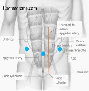 • The usual site for paracentesis is the left side but can be in either iliac fossa at least 10cm from midline or suprapubically (must ensure bladder is empty). The chosen site should avoid: distended bowel or bladder and inferior epigastric arteries. Guided by ultrasound marking if trained.