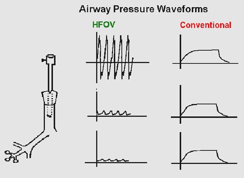 HFOV involves applying a pressure waveform over a continuous distending pressure. In most ventilators both the inspiratory and expiratory cycles are active i.e. gas is pushed in and pulled out. An alternative means of creating oscillation is by flow interruption.