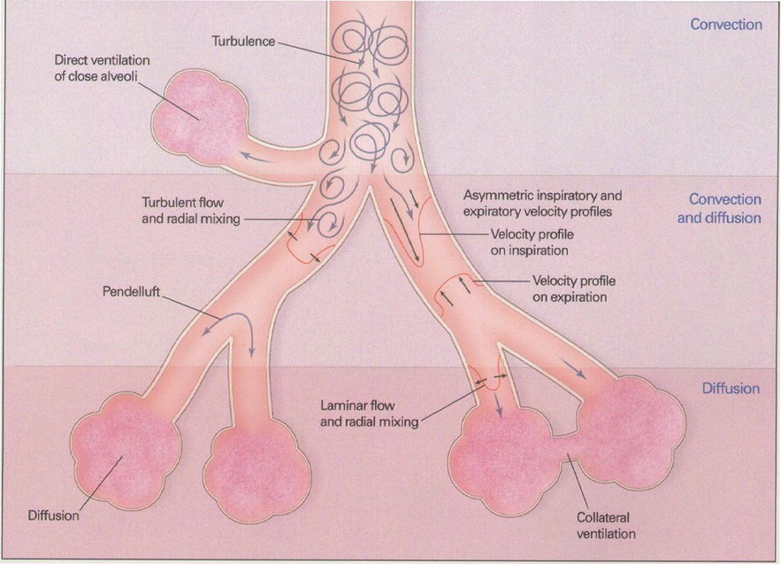 - Augmented (Taylor) dispersion - In the lungs, the branching network of the airways together with Pendelluft movement, leads to gas turbulence and mixing between the core and the periphery of the gas column and radial dispersion is eliminated. This results in greater gas mixing with lower tidal volumes.