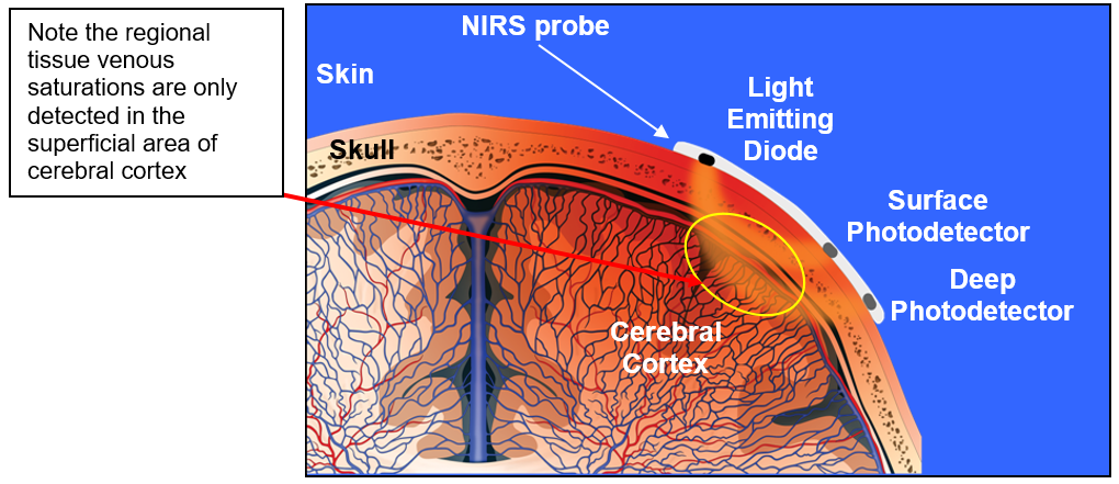 NIRS provides continuous, non-invasive monitoring of regional tissue oxygen saturation (%rSO2), therefore providing an indication of the balance between regional tissue oxygen delivery and extraction. The “NIRS value” is expressed as a % (rSO2) and reflects the amount of haemoglobin that remains saturated after passing through the local tissue bed.