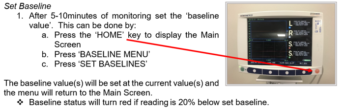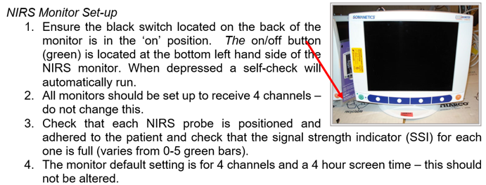- Check NIRS probe position and adherence (The signal strength indicator should display 5 green bars if optimal detection is being generated)