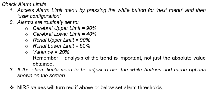 Cerebral rSO2 <40% is associated with neurological morbidity and requires urgent review - A difference of >10% between cerebral and renal is significant (Hoffman et al, 2004).