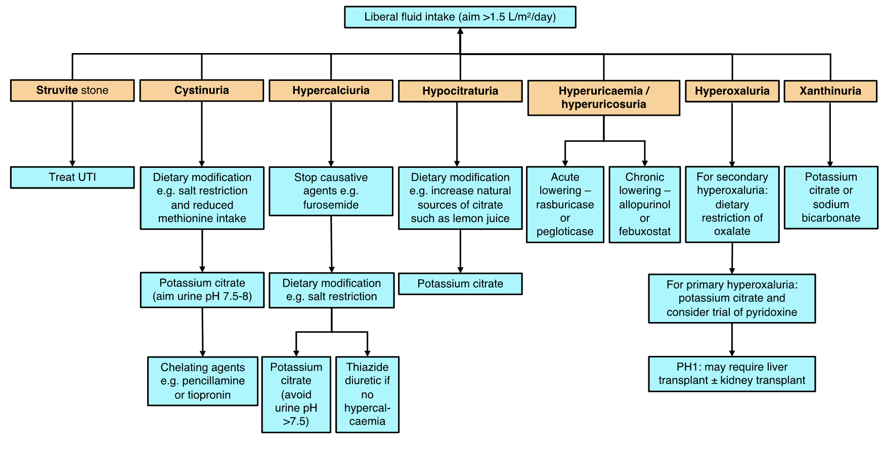- Primary hyperoxaluria (PH types 1, 2 or 3) – a group of rare autosomal recessive conditions associated with excess oxalate production and elevated urine oxalate levels. PH type 1 (PH1) is the most severe phenotypic form. It has an estimated incidence of 1:100,000 and is caused by variants in the AGXT Patients typically present in childhood with NC, recurrent UL, and progressive renal failure. Serum oxalate levels typically remain normal (i.e. < 10 µmol/L) until they reach stage 4 chronic kidney disease (CKD). In PH1, other organs may also be involved including the bones (pain and anaemia), eyes (retinopathy), nerves (neuropathy) and heart (arrhythmia and heart block). PH2 is rarer still and patients may present around adolescence with oxalate stones. CKD develops in ~10% of PH2 patients. PH3 has the mildest phenotype. For all patient with PH, dietary modification is not helpful as oxalate production is a generated by metabolic pathways rather than from an external source.