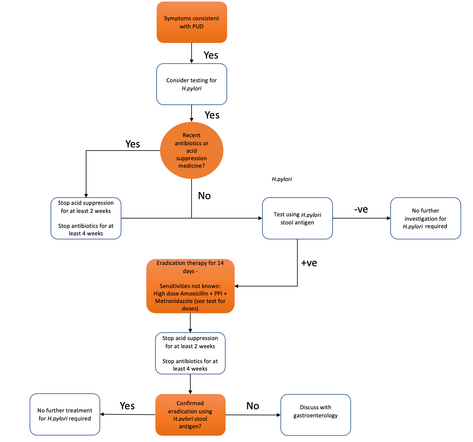 Upper gastrointestinal endoscopy with biopsy for histology is the recommended gold standard, largely because of its ability to formally diagnose PUD and so help stratify acid suppressant treatment thereafter.  Pragmatically, however, the balance of general anaesthetic risk and procedural expense means a great many children could be spared endoscopy with a simpler first-line approach.  We therefore recommend first-line diagnosis based on stool antigen testing, followed by eradication if positive.  Children should only be referred for gastroenterology opinion and endoscopy when they have failed to have a successful primary eradication of H. pylori confirmed by a positive repeat stool antigen test.