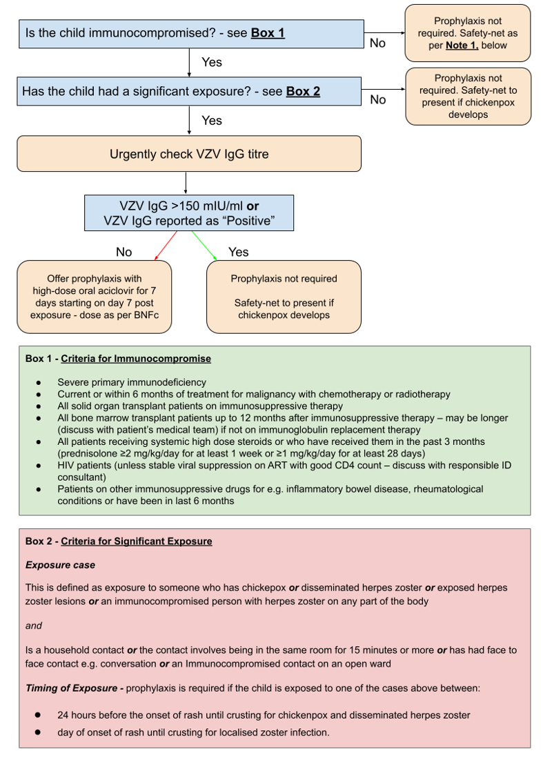The aim of post exposure prophylaxis is to protect individuals who are at high risk of severe chickenpox. Give prophylaxis to any child who is immunocompromised with a low antibody titre to Varicella Zoster Virus, after a significant exposure.2 Follow the flowchart below.