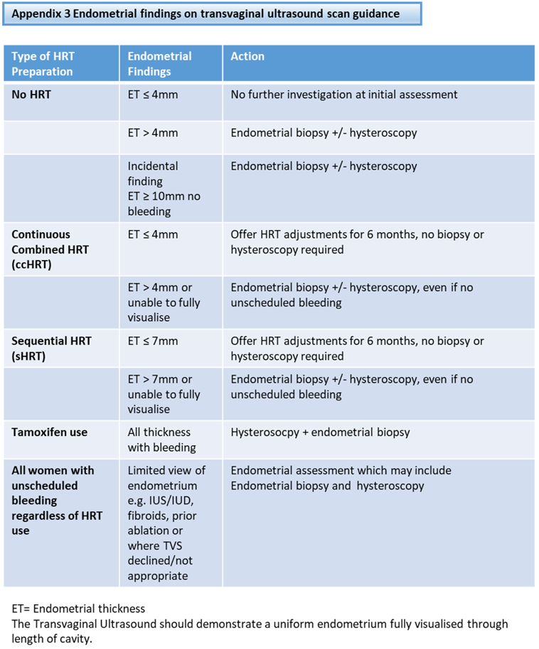 Endometrial biopsy is required if the ET exceeds 4mm (no HRT or continuous combined HRT) or exceeds 7mm (sequential HRT) [4]. The sample should be sent as ‘Urgent’ to the pathology laboratory.