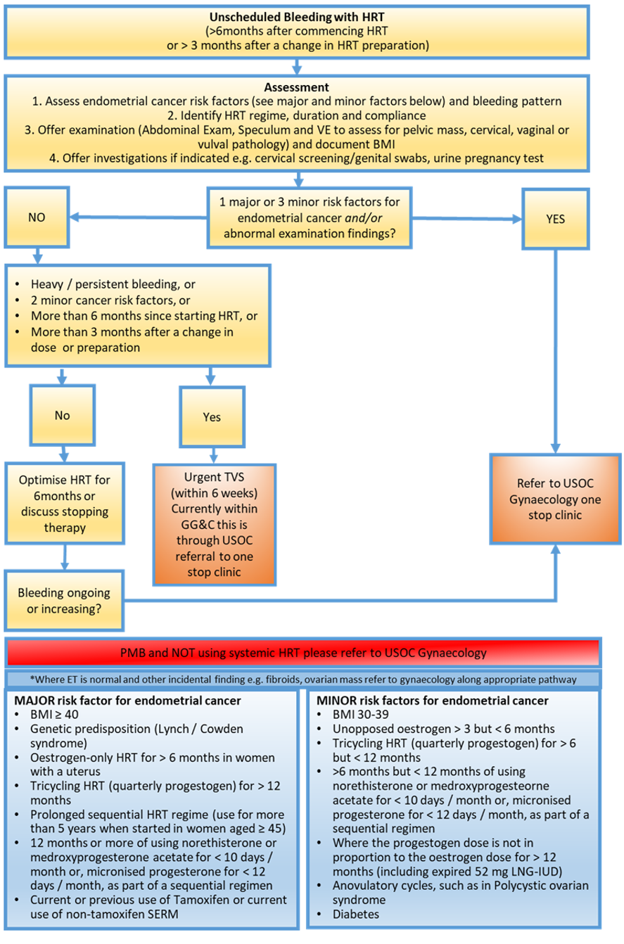 All women with PMB or unscheduled bleeding with HRT should have their measure of Body Mass Index (BMI) updated as this helps determine risk stratification.