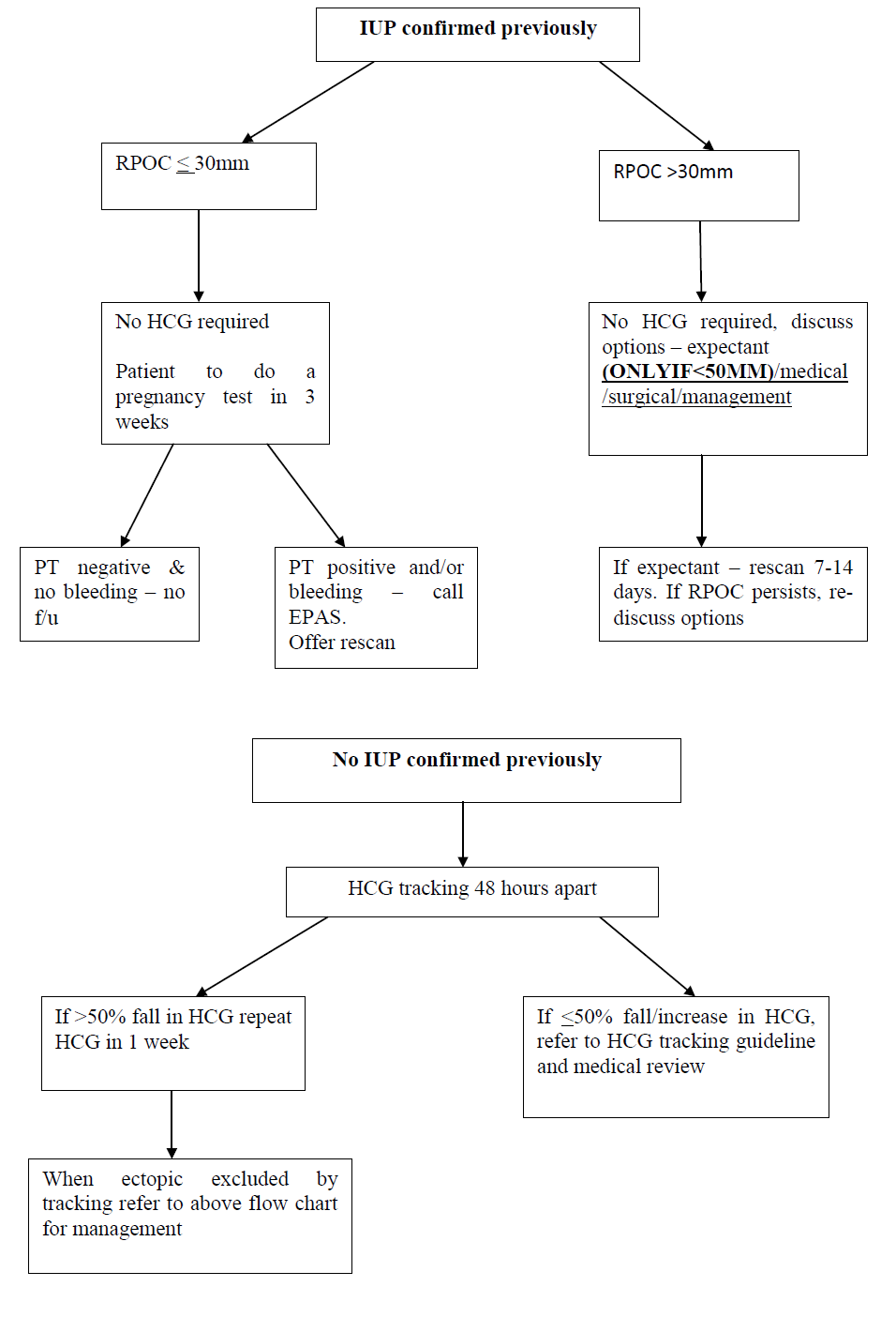 NICE Guidelines recommend that if bleeding is not heavy and women are clinically stable, all women wait 7 days and rescan undertaken before undergoing active treatment, if previous scan has identified an intrauterine pregnancy.