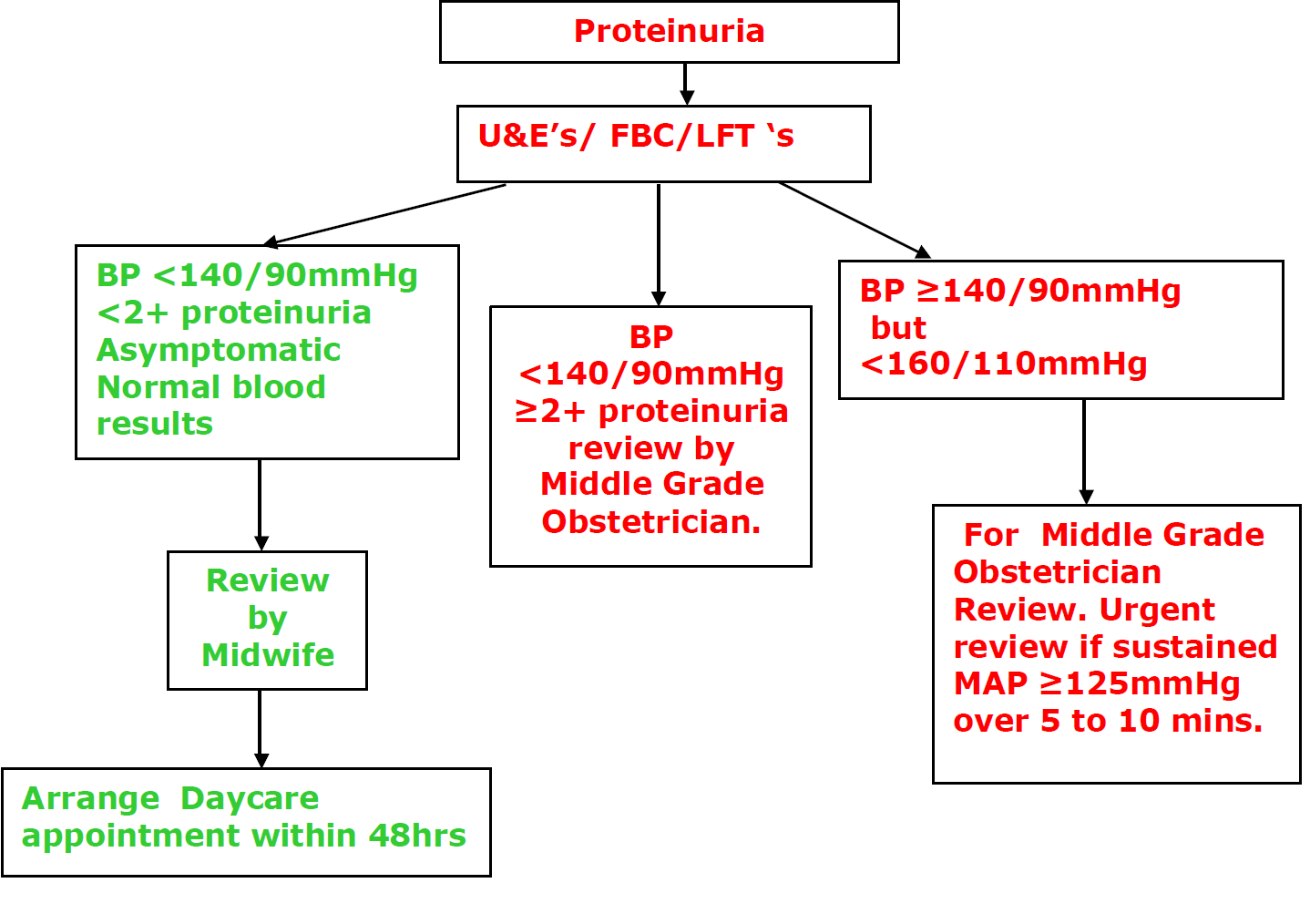 Day Care will review these patients Monday to Friday, between 08.30 – 16.30 hours Patients attending with hypertension require urinalysis. If hypertension and proteinuria check FBC, U & Es, and LFT’s.