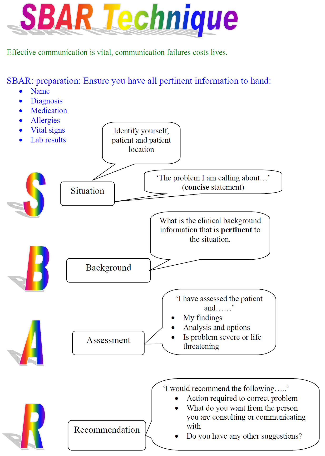 SBAR is an effective method of providing a concise and systematic method of sharing information. SBAR can be used in both verbal and written format in the emergency situation. SBAR should be used as a routine method to support effective handover of care information between clinicians.