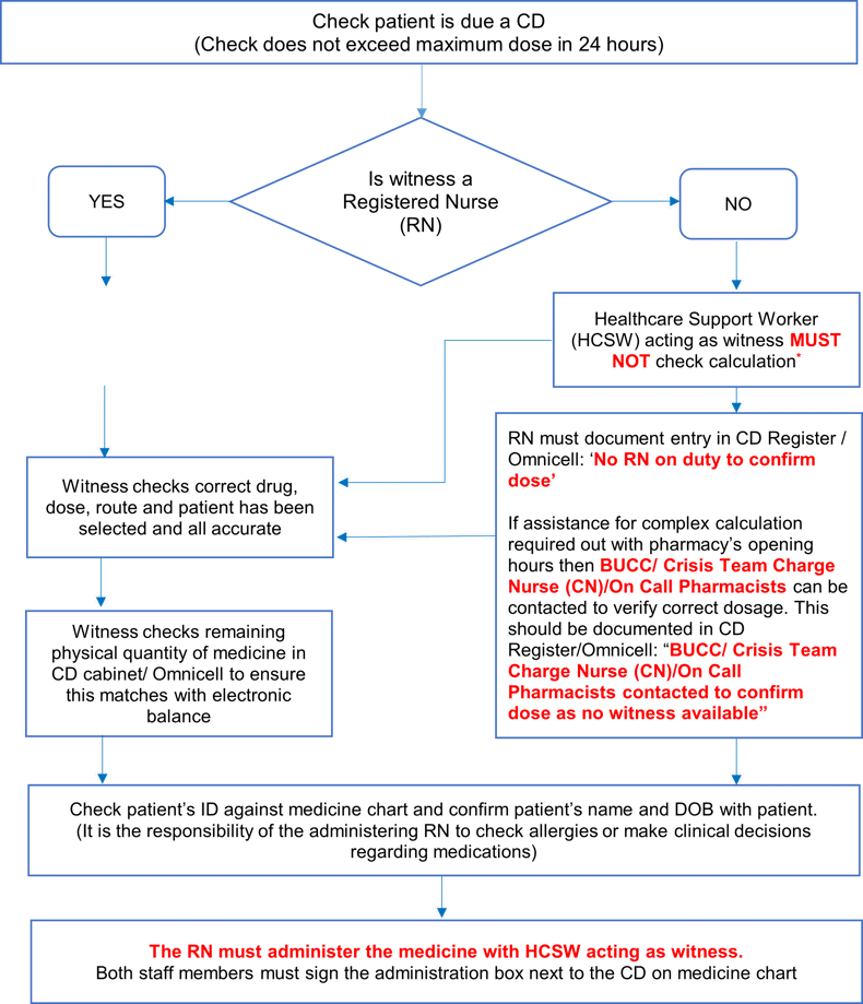 For the administration of Controlled Drugs (CD’s) where possible the staff undertaking the whole process from selection of the drug to administration should be 2 registered staff members.