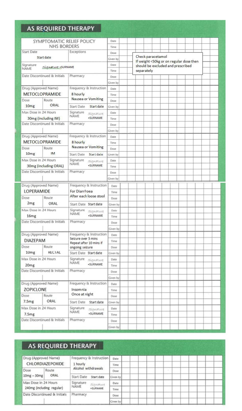 The Symptomatic Relief Policy (SRP) should be prescribed for all patients. It includes simple medications nurses can give without having to contact the duty doctor. Note, it includes paracetamol, if weight <50kg or patient on regular paracetamol, exclude from the SRP and ensure there is an alternative prescription on the Kardex.