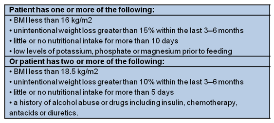 Table 1: Criteria for determining people at high risk of developing refeeding problems. (NICE 2006,2017)