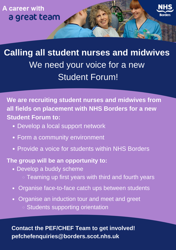 We are recruiting student nurses and midwives from all fields on placement with NHS Borders for a new Student Forum to: