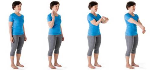 Start with your arm straight and reach forwards and up then return to the starting position. Then reach out to the side and up.