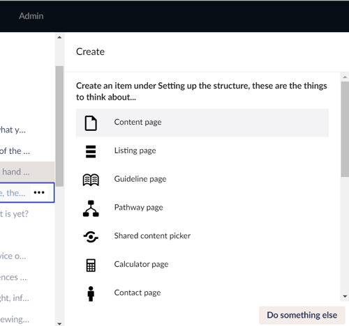 Using the left hand button of the mouse to click the ... symbol next to a given toolkit or section heading will produce a list of page types which can be created below the selected item. More information on these page types is provided in the following section, under the heading "Adding toolkit pages".