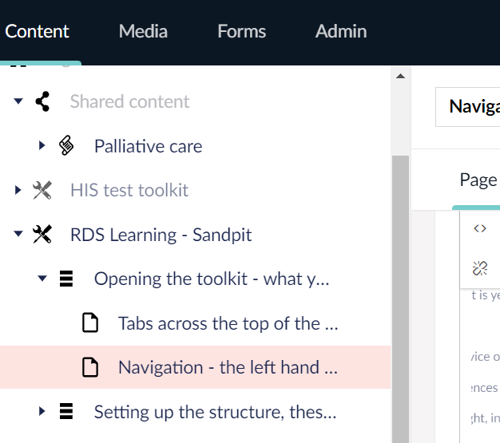 On the left-hand side of the content management system screen, you will see the navigation panel This shows a list of all of the toolkits to which you currently have access, as well as their internal structure.
