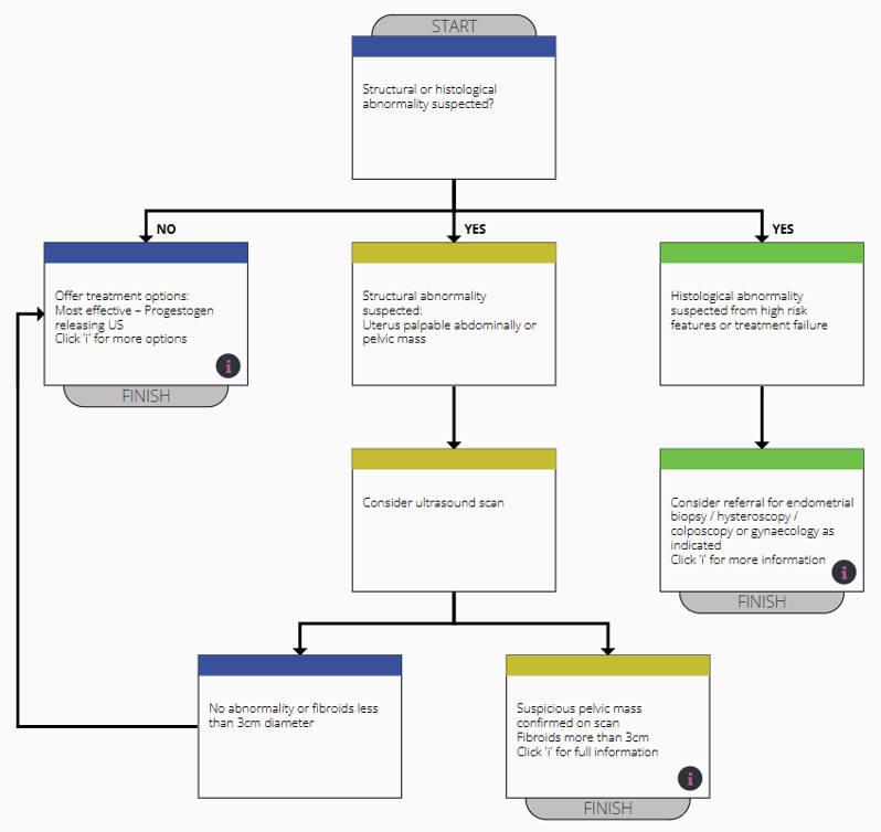 • Consider need for pelvic exam, dependent on history of any concerning features and hence imaging e.g. fibroids, pelvic mass.