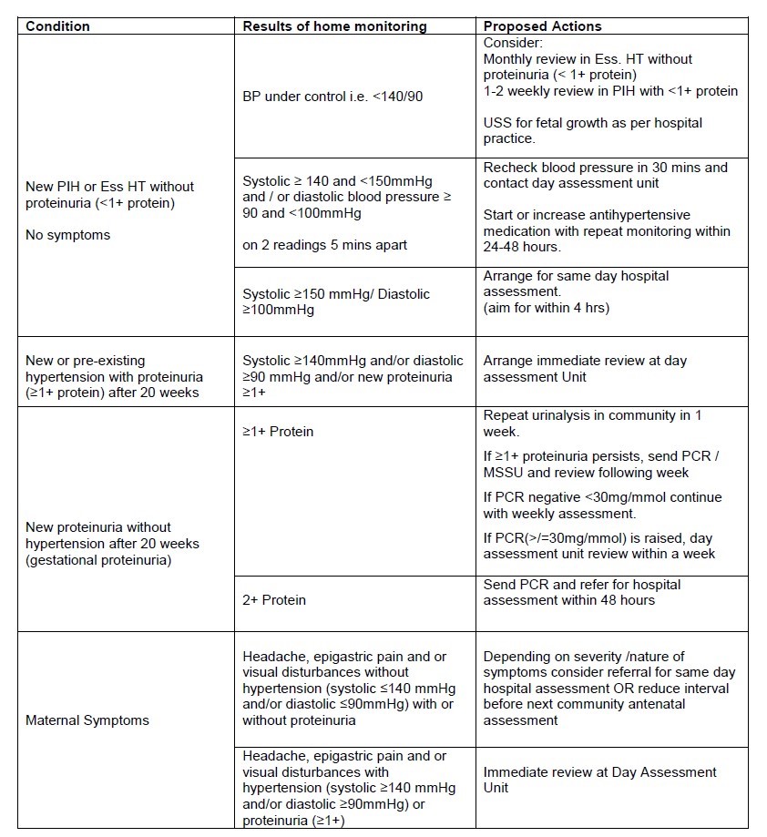 Home blood pressure monitoring should NOT replace any appointment where a woman is receiving clinical review for her underlying medical condition (e.g. for respiratory review of cystic fibrosis or cardiac review of underlying cardiac condition) or where fetal assessment is required as part of the clinical review.