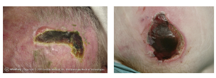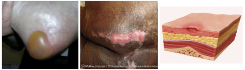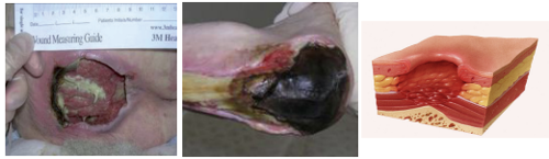 **The depth of a Grade 3 or 4 pressure ulcer varies by anatomical location. Areas such as the bridge of the nose, ears, occiput and malleolus do not have fatty tissue so the depth of these ulcers may be shallow. In contrast areas which have excess fatty tissue can develop deep Grade 3 pressure ulcers where bone, tendon, muscle is not directly visible or palpable.
