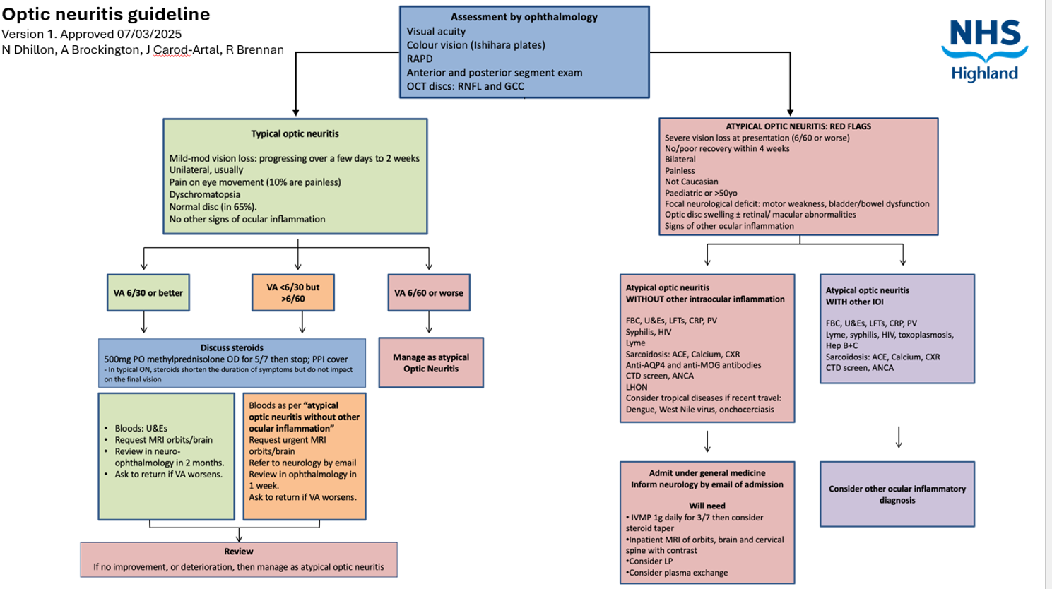 This guidance outlines the acute diagnostic evaluation and initial management of patients presenting with suspected optic neuritis in the eye casualty department.