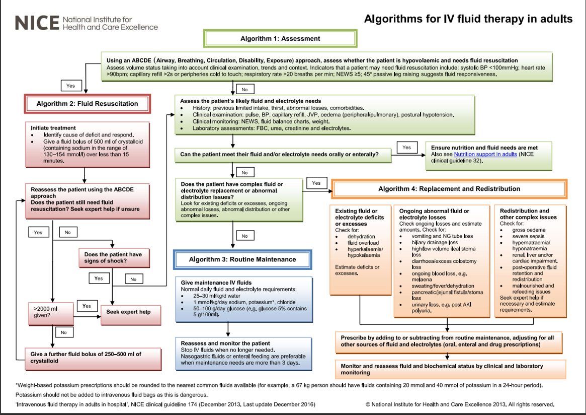 See: NICE Algorithms for IV fluid therapy in adults-poster-set-pdf-191627821. Page 1 copied below:
