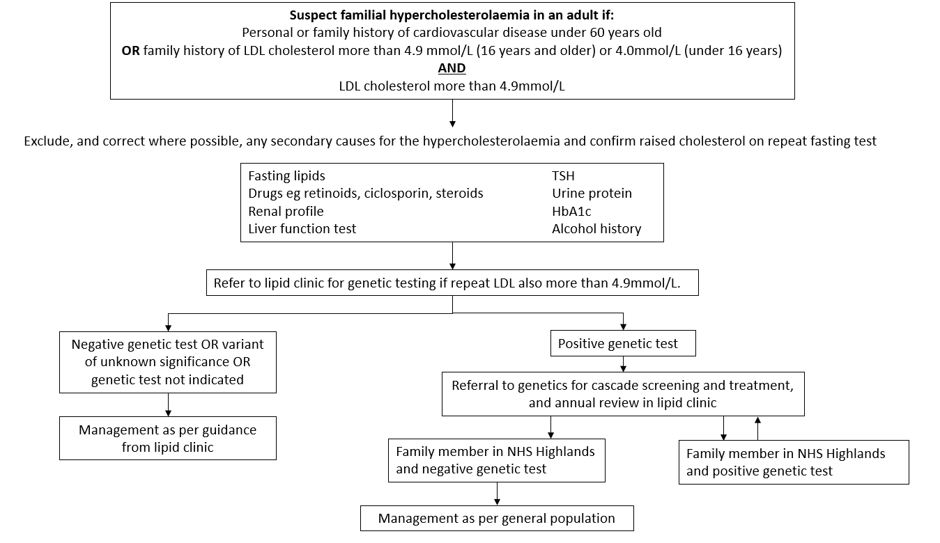 - If family members are outwith NHS Highland: the patient will be given letters to pass to their family members to allow local cascade testing for familial hypercholesterolaemia.