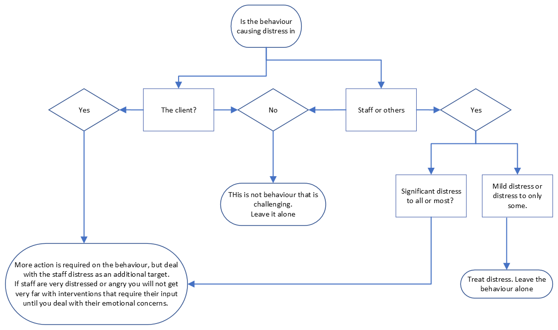 Consider who is distressed and where to focus treatment. This Decision Tree (Bird et al 2012) is to help identify who is distressed (staff distress or patient distress) and therefore where to target treatment.