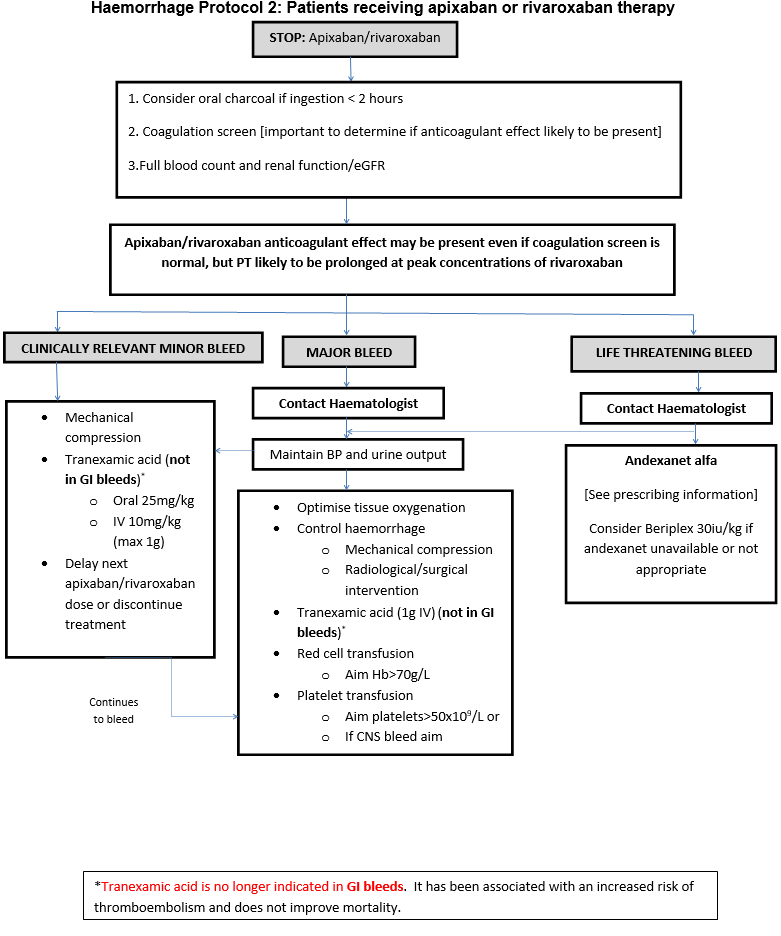 - Bleeding that is symptomatic and occurs in a critical area or organ, such as intracranial, intraspinal, intraocular, retroperitoneal, pericardial, in a non-operated joint, or intramuscular with compartment syndrome, assessed in consultation with the surgeon.