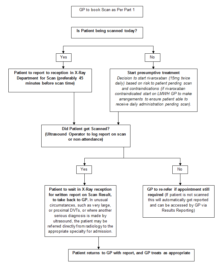 Patients who are considered on clinical grounds as being at moderate or high risk of DVT (Wells’ score -2) and who are not getting ultrasound and follow up the same day should be treated with rivaroxaban pending confirmation of diagnosis.