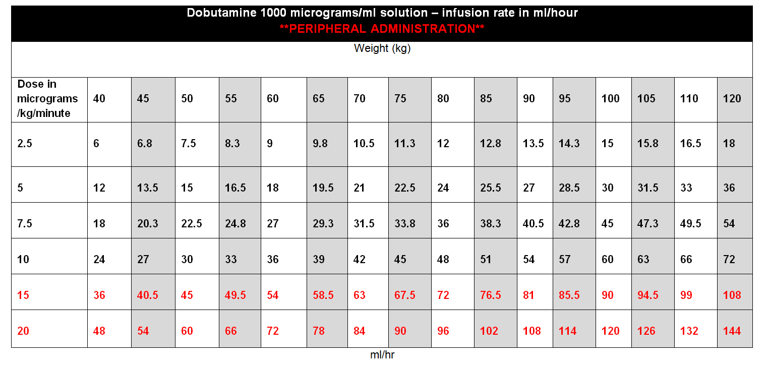 | Dobutamine (peripheral) | 250mL bag via volumetric pump |