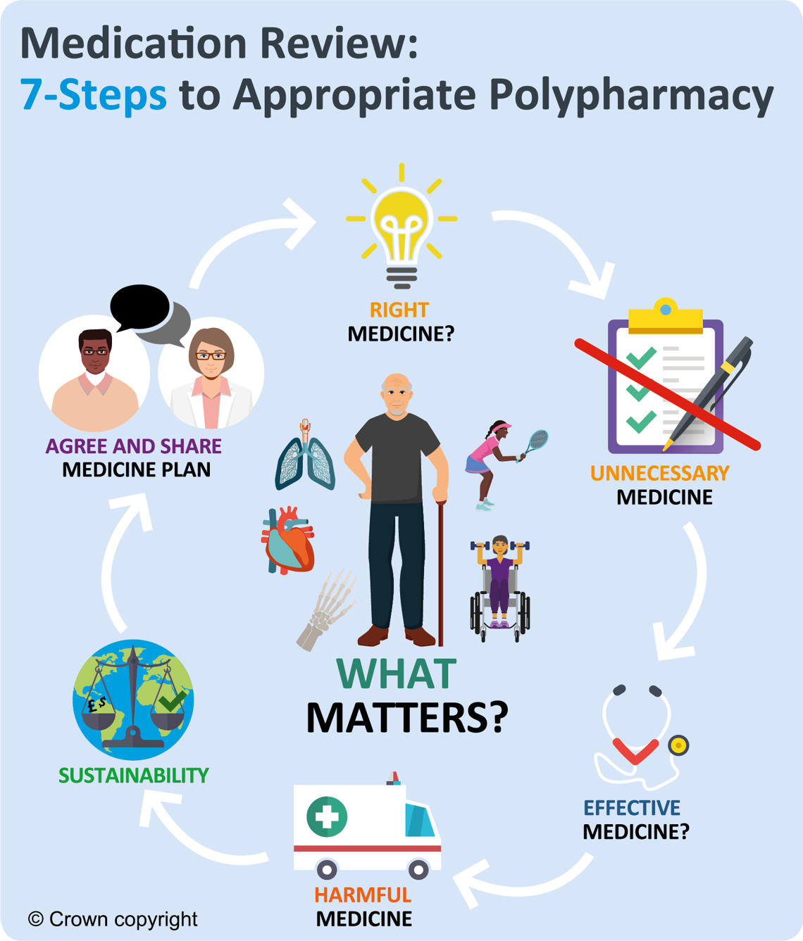 The 7-Steps to appropriate polypharmacy demonstrate that the review process is not in fact a linear single event, but cyclical, requiring regular repeat and review (see figure below). The circle is centred on what matters to the individual, ensuring they are provided with the right information, tools and resources to make informed decisions about their medicines and treatment options. It should be used at both initiation and review of medicines.