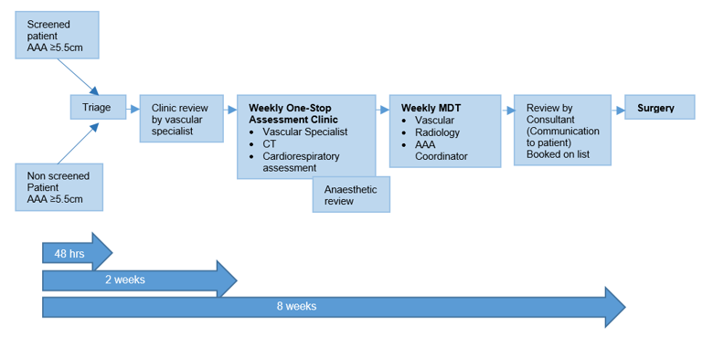 A single pathway should be established for all patients with aneurysms in Scotland, supported by a dedicated local co-ordinator, an efficient ‘one stop’ pre-operative assessment service, with ‘lifestyle’ advice given at the time of diagnosis, as well as adequate resource for timely operative intervention. For most patients it should be possible to complete this within 8 weeks of diagnosis.